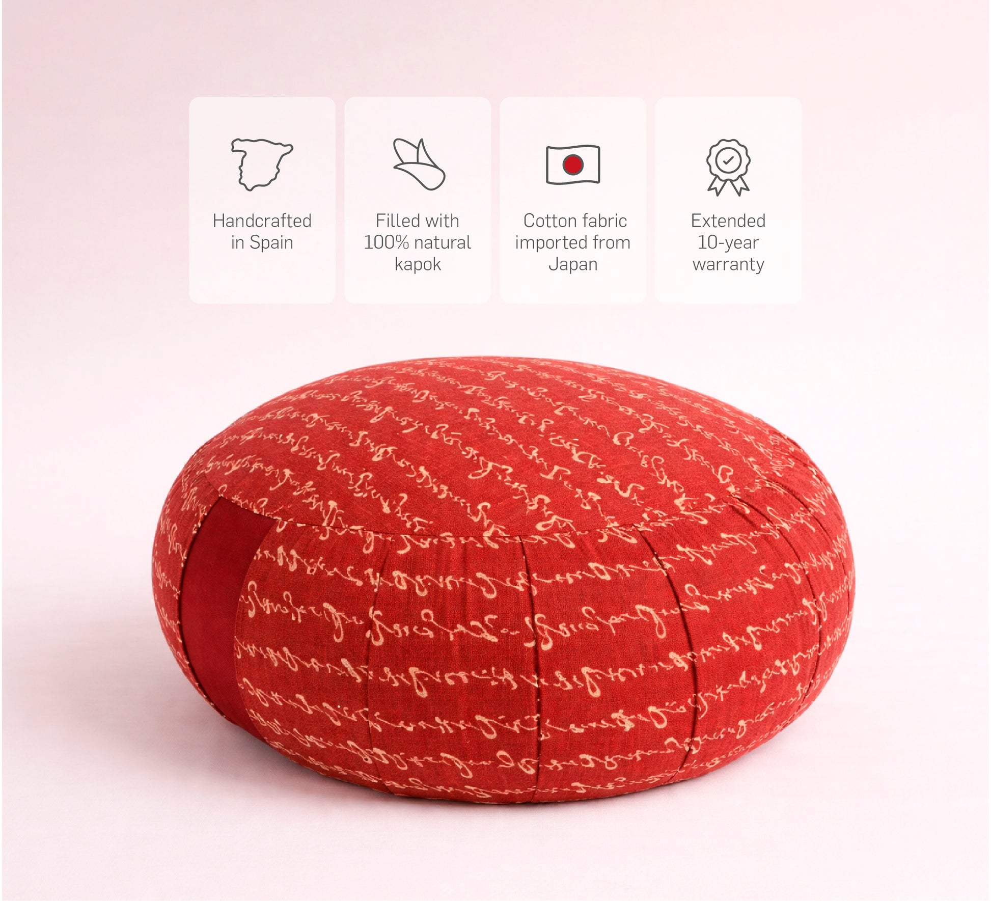 Dieses Zafu wird in Spanien in bewusster Handarbeit mit dreifacher Naht aus einem aus Japan importierten Baumwollstoff hergestellt. Der Stoff ist mit einem Text in Hiragana-Kalligraphie, einer der japanischen Silbenschriften, bedruckt. Es handelt sich um ein buddhistisches Gedicht, das über die Unbeständigkeit nachdenkt und uns an die Vergänglichkeit des Lebens und die Schönheit des gegenwärtigen Augenblicks erinnert:
