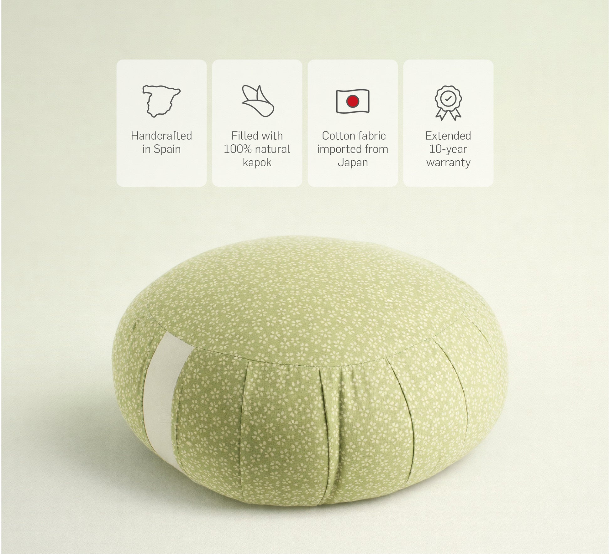 Dieses Zafu wird in Spanien in bewusster Handarbeit mit dreifachen Nähten und einem aus Japan importierten Baumwollstoff hergestellt. Die Sakura-Kirschblüte ist ein sehr beliebtes traditionelles Motiv in Japan. Da sie den Frühling ankündigt, ist diese Blume ein Symbol der Erneuerung.
