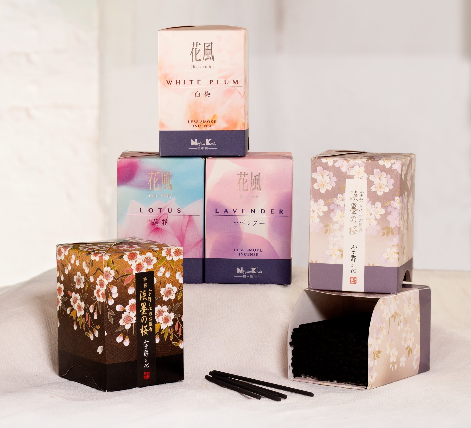 - Description: 1 short Japanese incense of each fragrance. Total: 5 boxes.