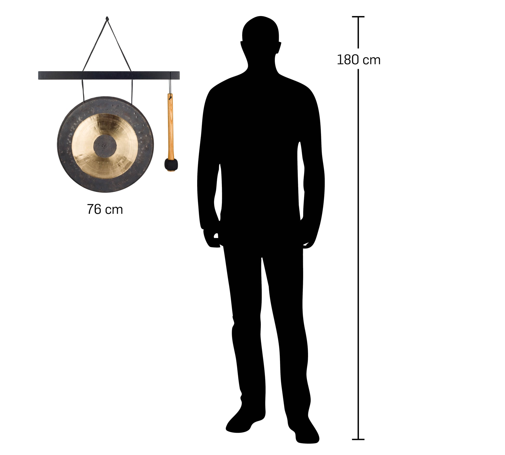 - Description: 76 cm overall lenght, 51 cm wide, 33 cm Ø, black finish ash wood, hand-hammered bronze and black bull's-eye gong, mallet