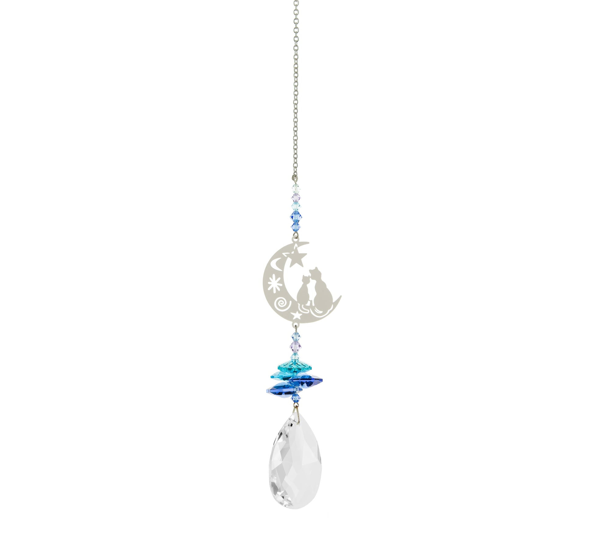 Estos dos gatos contemplan la luna sobre una cascada de cristal que, según el feng shui, permite activar la energía natural qi y equilibrarla para proporcionar armonía, felicidad y prosperidad en el hogar. Cuélgala junto a una ventana y cada vez que el sol brille, los cristales proyectarán múltiples arcoíris en las paredes de la habitación. Esta fantasía incorpora cristales de calidad y se remata con un colgante transparente para crear más arcoíris.