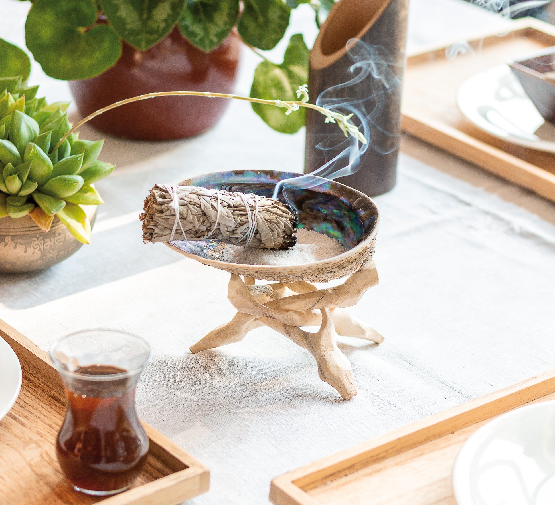 Tallado a mano en un único trozo de madera, este trípode sirve para dejar la concha de abulón. Permite aislar la superficie del posible calor de las hojas que se queman.