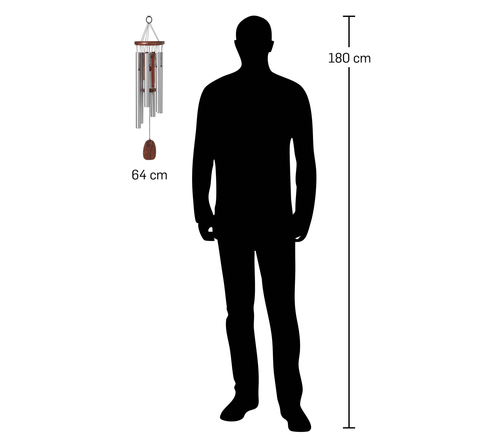 - Descripción: Altura total de 64 cm, 6 tubos de aluminio plateado, 4 pequeños tubos de bambú, madera de fresno con acabado teca. La veleta es extraíble para que puedas personalizar tu campana de viento si lo deseas.
