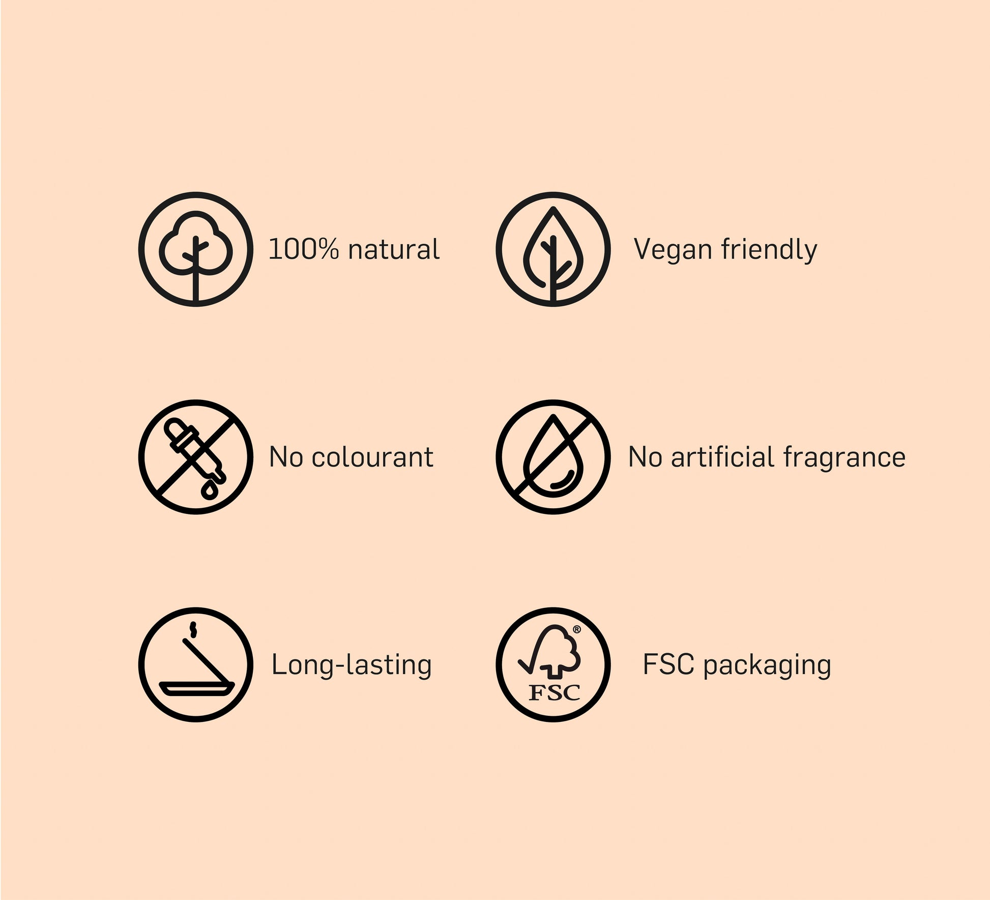Profitez de matières premières de qualité supérieure avec la commodité d'un bâtonnet japonais. L'absence de support en bambou permet de préserver les qualités et le caractère unique de chaque ingrédient. Laissez opérer la magie grâce aux neuf senteurs que nous avons sélectionnées avec soin !