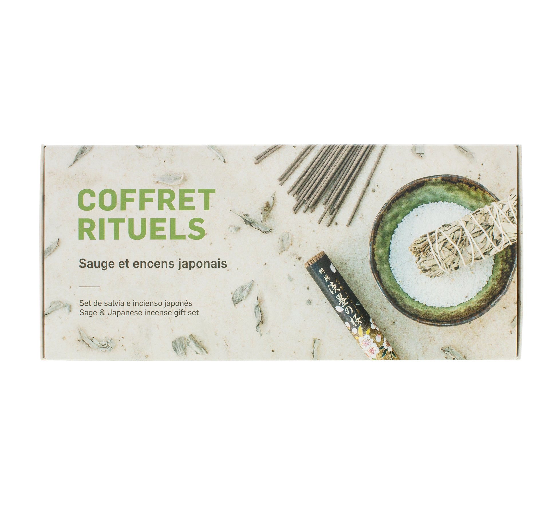 - Description: Boîte : 29,2 x 13,2 x 4,2 cm. Brûle-parfums en céramique : Ø 11 x H 3,4 cm. Sauge blanche : 8-10 cm. Encens japonais Tokusen Sakura Usuzumi : environ 50 bâtonnets. Sable de marbre et allumettes. Film protecteur en plastique 100% recyclable.