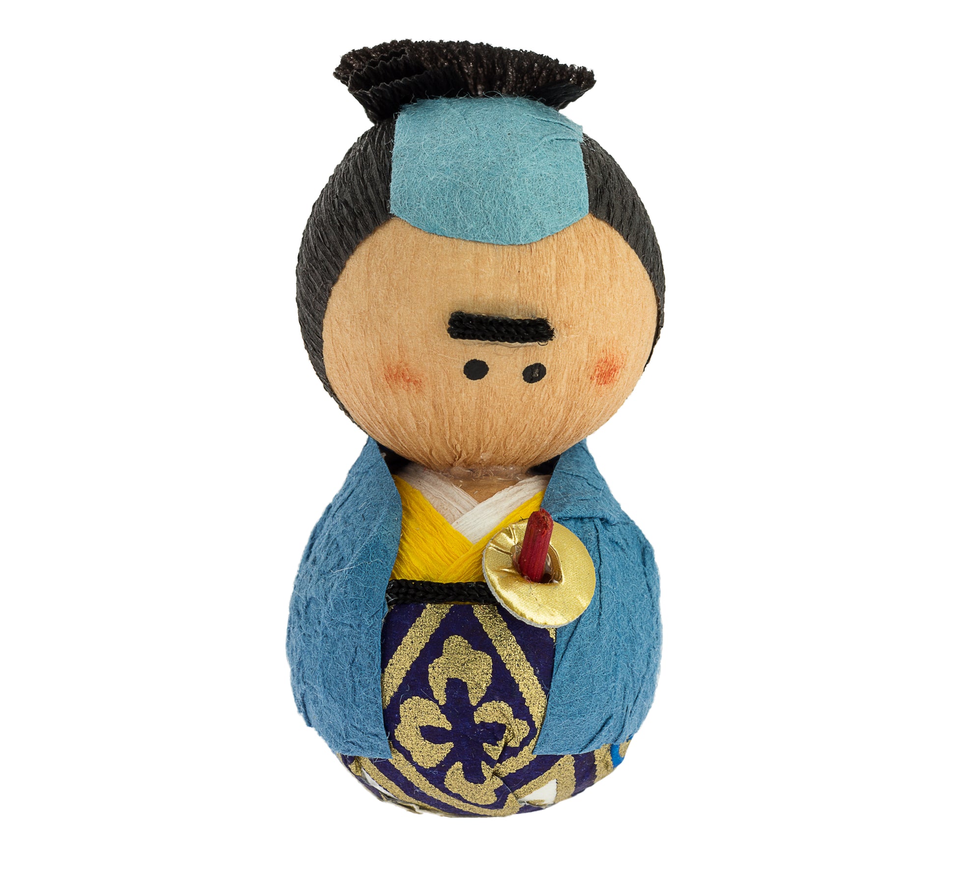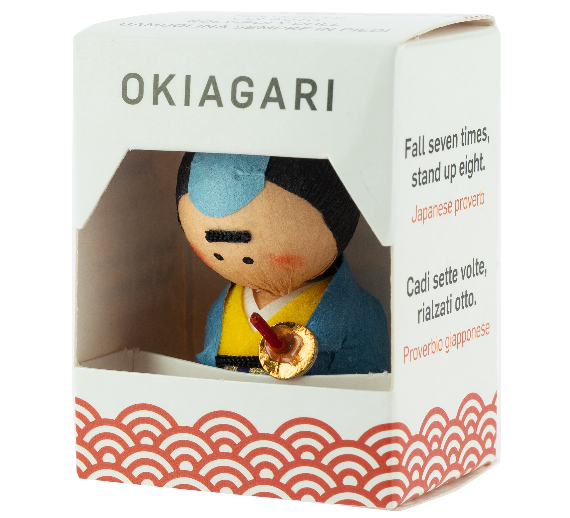 Okiagari-koboshi veut dire « petit prêtre se mettant debout ». Il s’agit d’un culbuto traditionnel japonais fait avec du papiermâché et conçu de telle façon à toujours revenir en position verticale lorsqu’il est incliné sur le côté. Les okiagaris apparaissaient déjà dans des écrits du XIVème siècle.