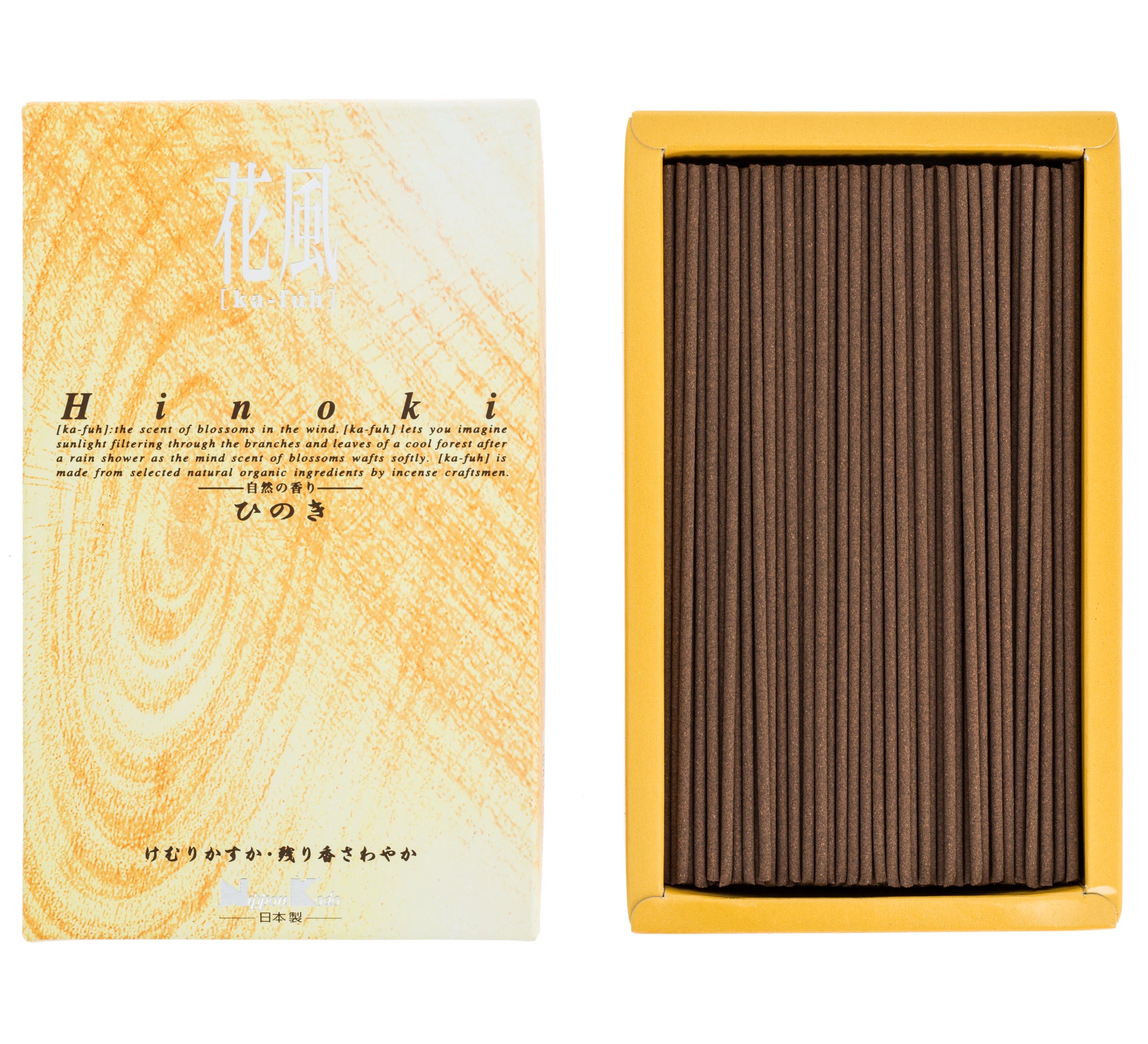 Ka-fuh Hinoki restitue la senteur du majestueux cyprès du Japon, qui pousse droit et haut sur les îles du Pays du Soleil Levant. Cet encens est fait avec de l’huile essentielle d’hinoki mélangée avec d’autres résines pour exprimer une sensation de plaisir encore plus raffinée. Encens doux et naturel, son parfum restera longtemps dans votre cœur. Laissez-vous envoûter par l’arôme frais, sec et tonifiant d’une forêt de cyprès ; il stimule la pensée et clarifie l’esprit. L'hinoki a également des propiétés antibactériennes reconnues. Concentration et décision.