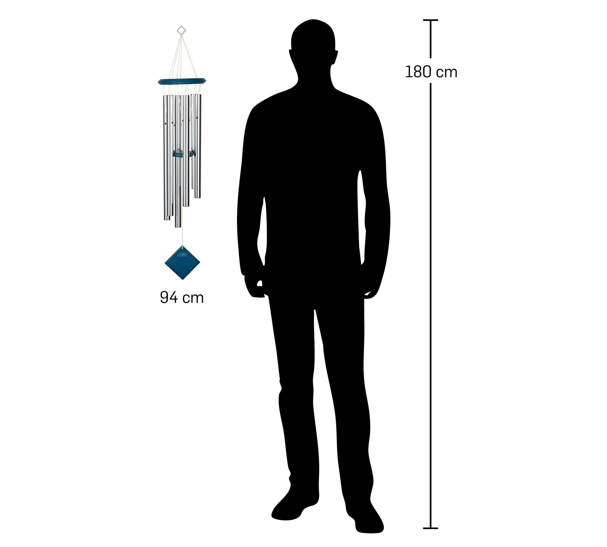 - Description: Hauteur totale de 94 cm, 6 tubes en aluminium argenté, bois de couleur bleue. La girouette est amovible afin que vous puissiez personnaliser votre carillon si vous le souhaitez.
