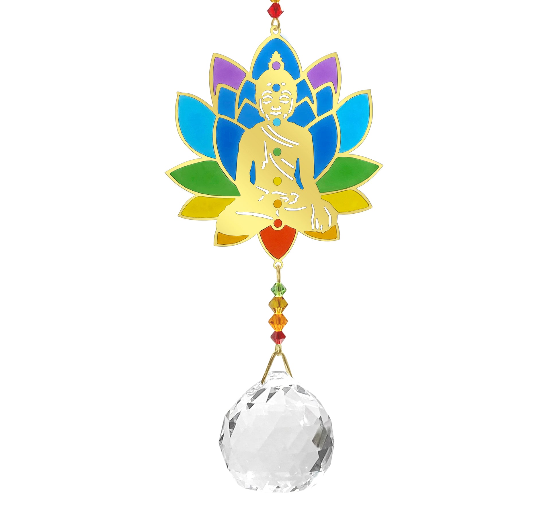 Le Bouddha est le symbole par excellence de la paix intérieure. Il est souvent représenté dans une posture méditative assis sur une fleur de lotus : elle représente la promesse de salut car elle s'élève pure au-dessus des eaux boueuses. Ce Bouddha porte les couleurs des 7 chakras, les centres énergétiques qui distribuent l'énergie dans le corps humain. On dit que lorsqu'ils sont ouverts et activés, nous menons une vie équilibrée.Utilisation des cristaux Feng Shui