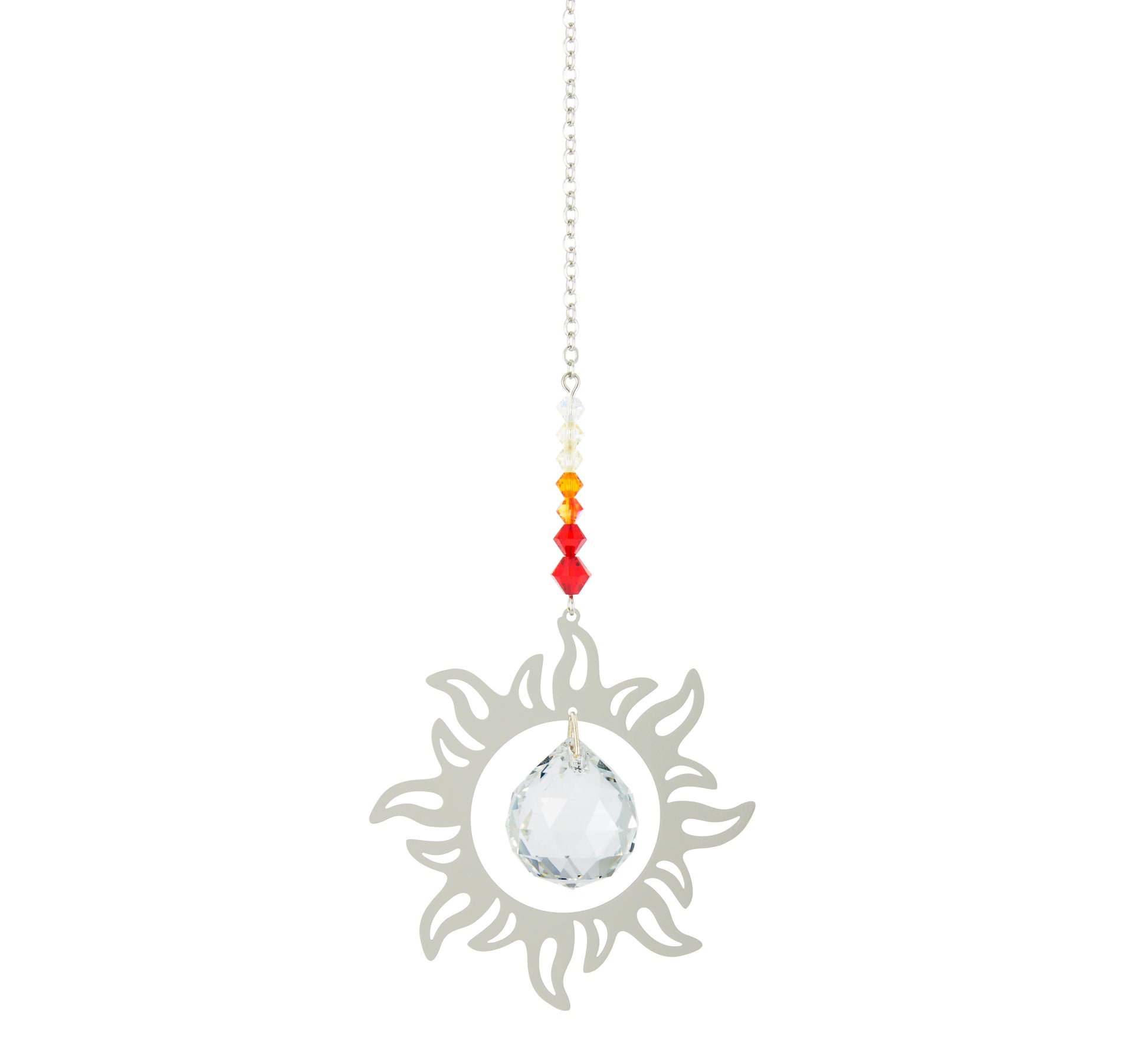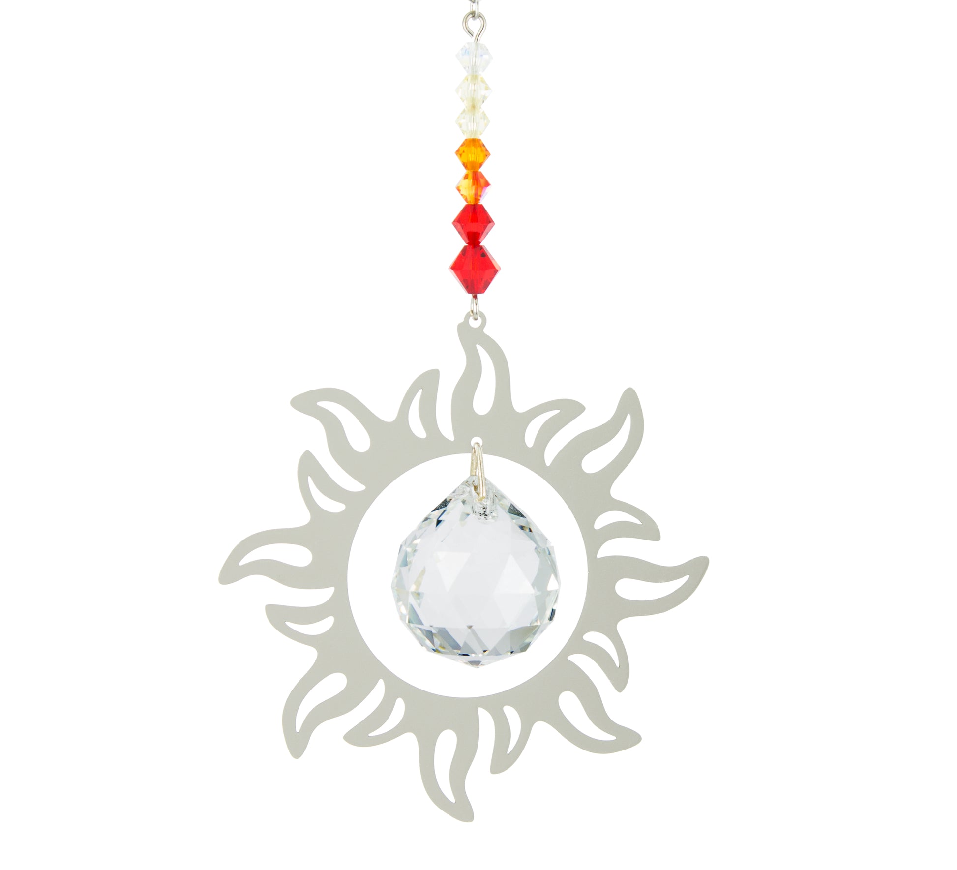 - Description: Embelli avec du cristal autrichien de qualité, chaîne et silhouette en métal, sphère Ø 2 cm, cristaux 3 cm, soleil 6 cm. Hauteur totale 20 cm. Livré avec un sachet en tissu d'organdi et une ventouse.
