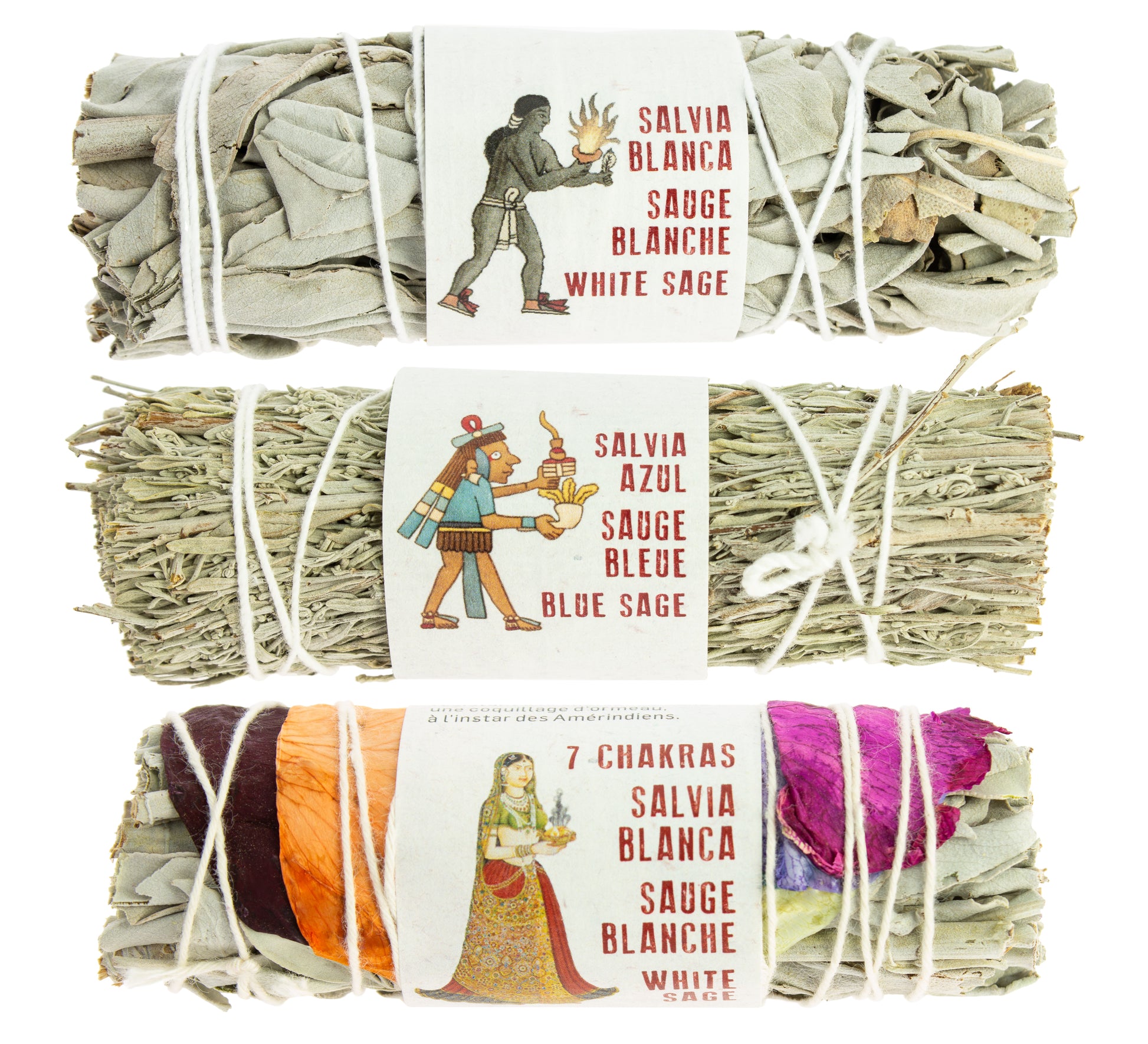 Confezione di tre fasci contenenti Salvia Bianca della California, Salvia Blu e Salvia Bianca 7-Chakra per realizzare rituali di sbavatura a casa.