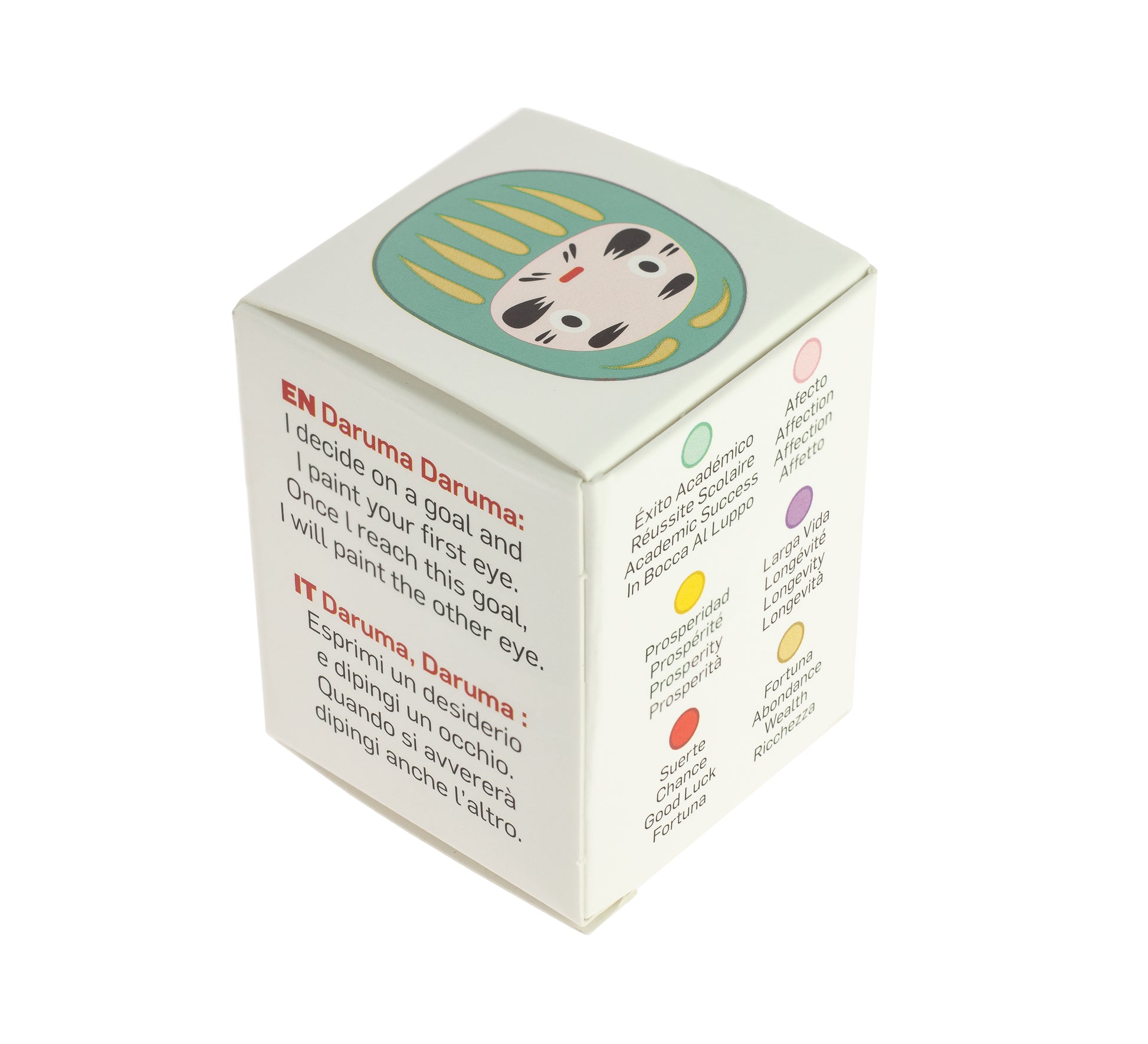 Decida un obiettivo e dipinga il primo occhio sul Daruma. Quando raggiunge il suo obiettivo, dipinga il secondo occhio come segno di gratitudine. Per imparare, scriva come ha raggiunto il suo obiettivo; in quel momento, proverà una grande soddisfazione.Lo spirito del daruma