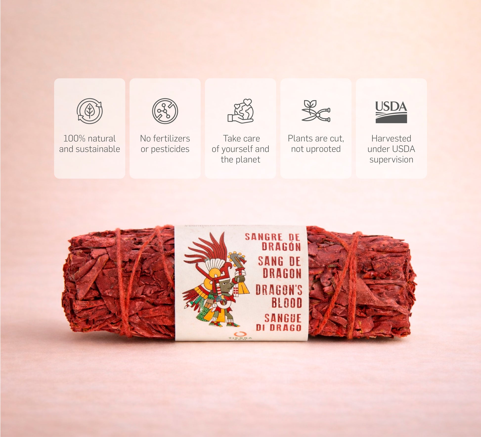 Nelle foreste dell'Indonesia cresce la palma Calamus draco. Il frutto del suo fiore femminile produce una resina di colore rosso intenso, nota come sangre de drago, che è stata utilizzata da tempo immemorabile dagli abitanti del luogo per usi terapeutici.I fasci di salvia bianca sono immersi in questo antiossidante naturale che le conferisce il suo intenso colore rossastro, rafforza le sue proprietà purificanti e protettive e addolcisce il suo aroma quando viene bruciata.Per quanto riguarda la sua coltivazione