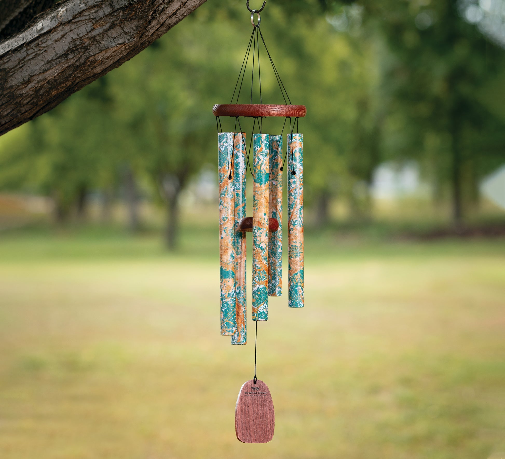 Esta campana está acabada mediante impresión UV. Esta técnica única y versátil, que combina luz ultravioleta y tintas especiales, permite a Woodstock imprimir diseños exclusivos en una gran variedad de materiales (madera, aluminio, acrílico o vidrio). El acabado resultante es resistente a la intemperie y la campana de viento puede colocarse en el exterior sin problema. La afinación de los tubos está garantizada de por vida.