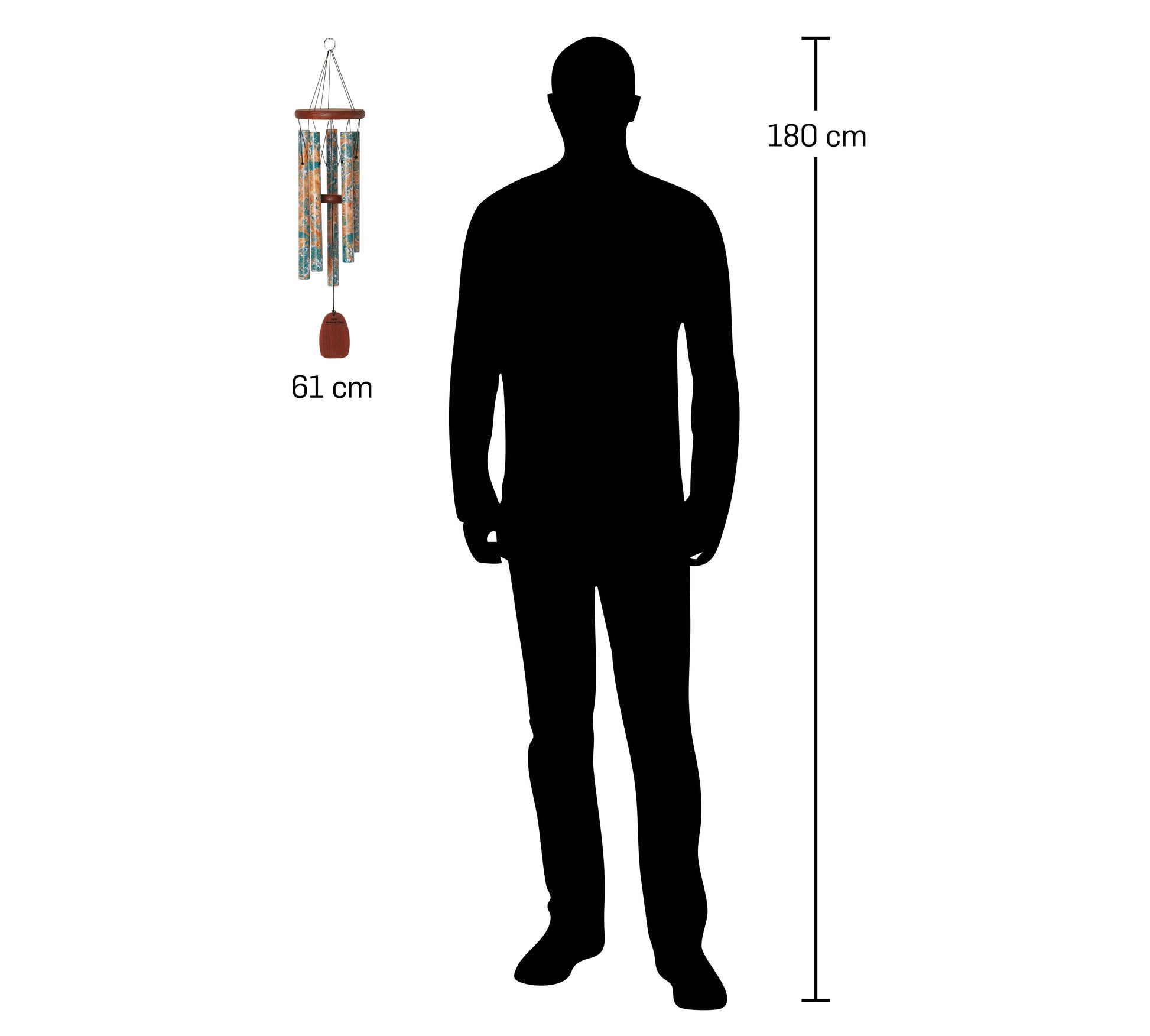 - Descripción: Altura total de 61 cm, 5 tubos de aluminio impresos, madera de fresno con acabado caoba. La veleta es extraíble para que puedas personalizar tu campana de viento si así lo deseas.