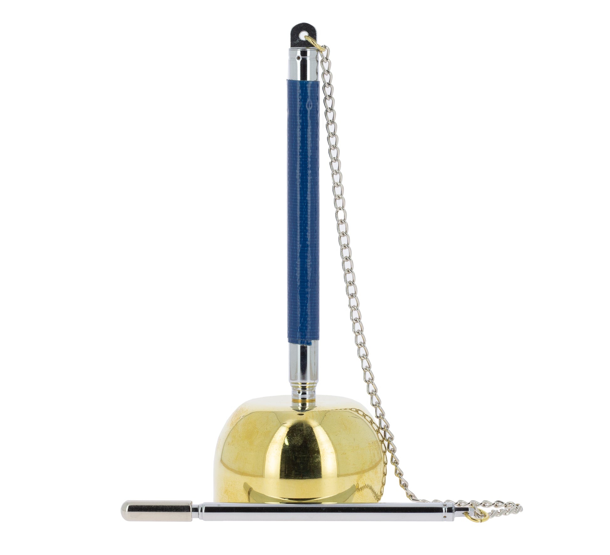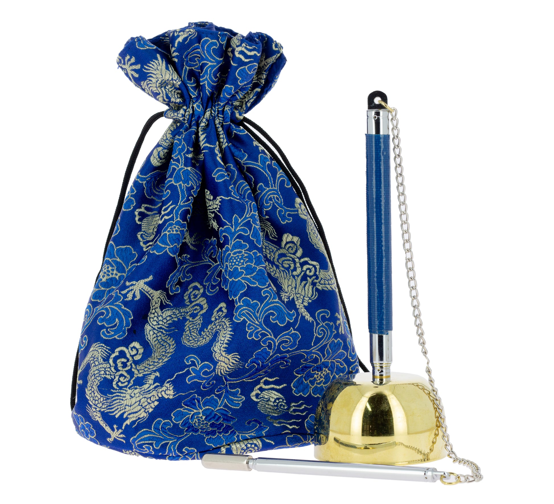 - Descripción: Cuenco dorado de diámetro 6 cm. Mango y mazo telescópicos. Altura total con mango extendido: 32 cm. Altura de la baqueta extendida: 23,5 cm. Incluye bolsita de tela.