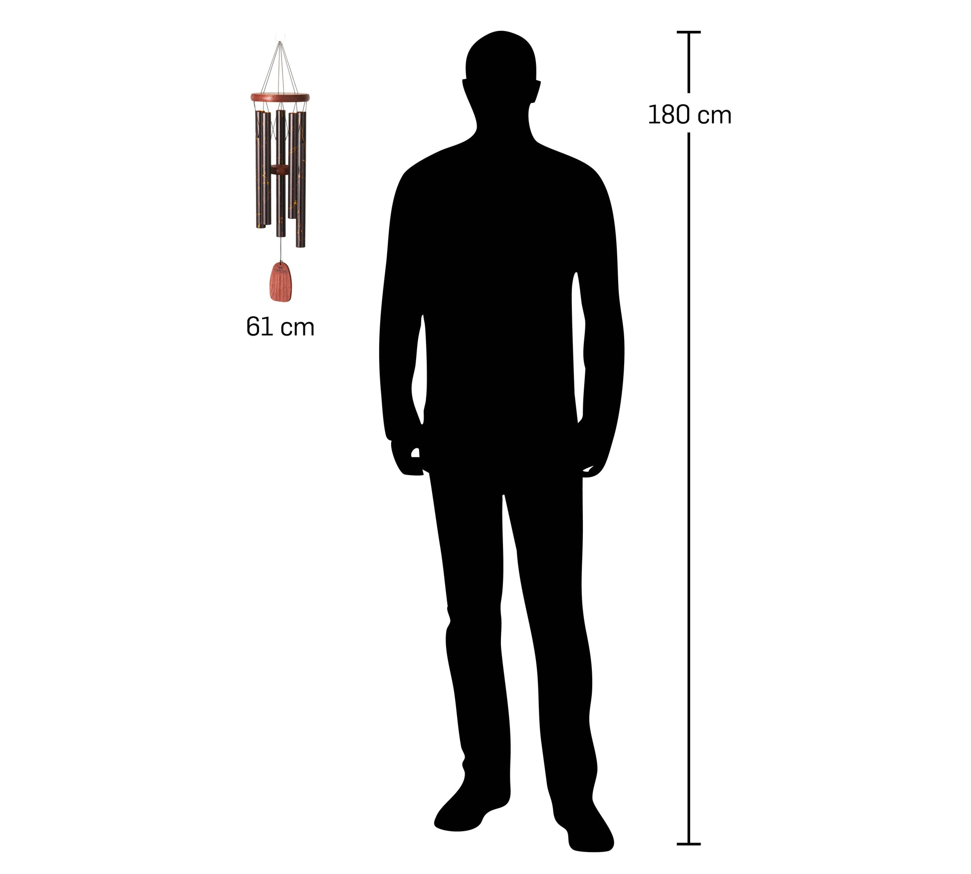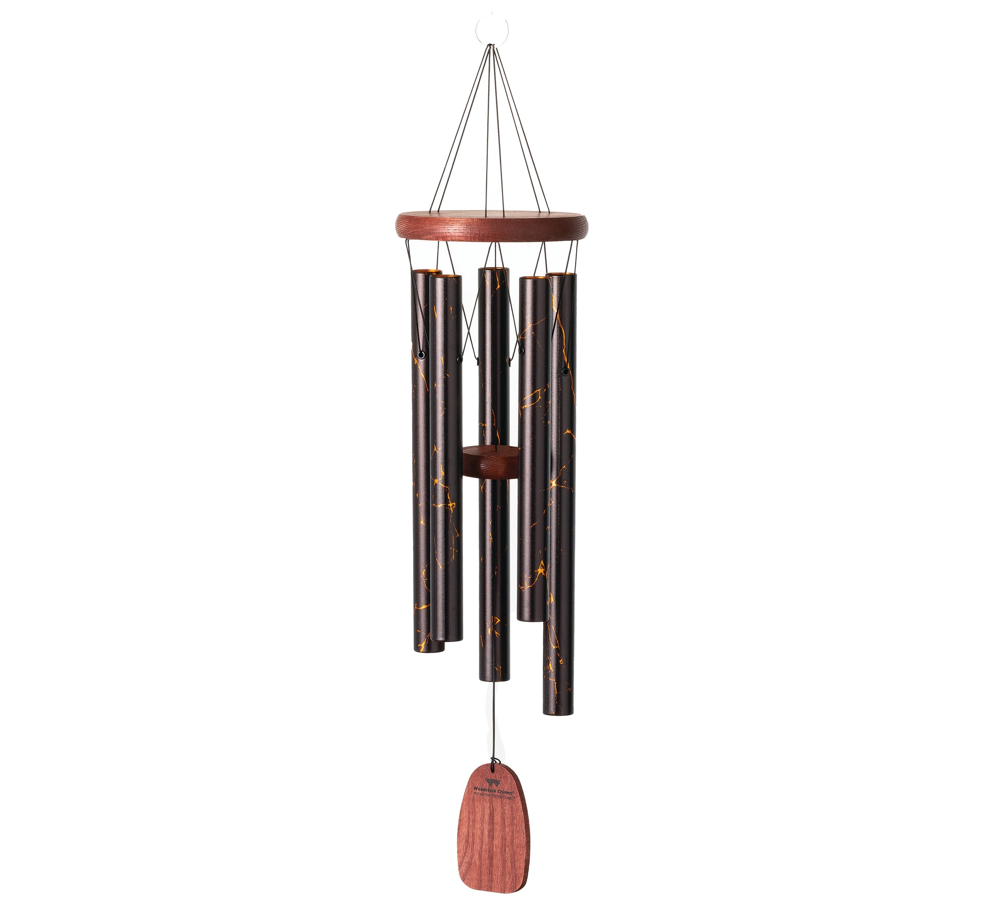 Este carrilhão de vento é acabado com impressão UV. Esta técnica única e versátil, que combina luz ultravioleta e tintas especiais, permite à Woodstock imprimir desenhos exclusivos numa grande variedade de materiais (madeira, alumínio, acrílico ou vidro). O acabamento resultante é resistente às intempéries e o carrilhão pode ser colocado no exterior sem qualquer problema. Os tubos têm uma garantia vitalícia de afinação.