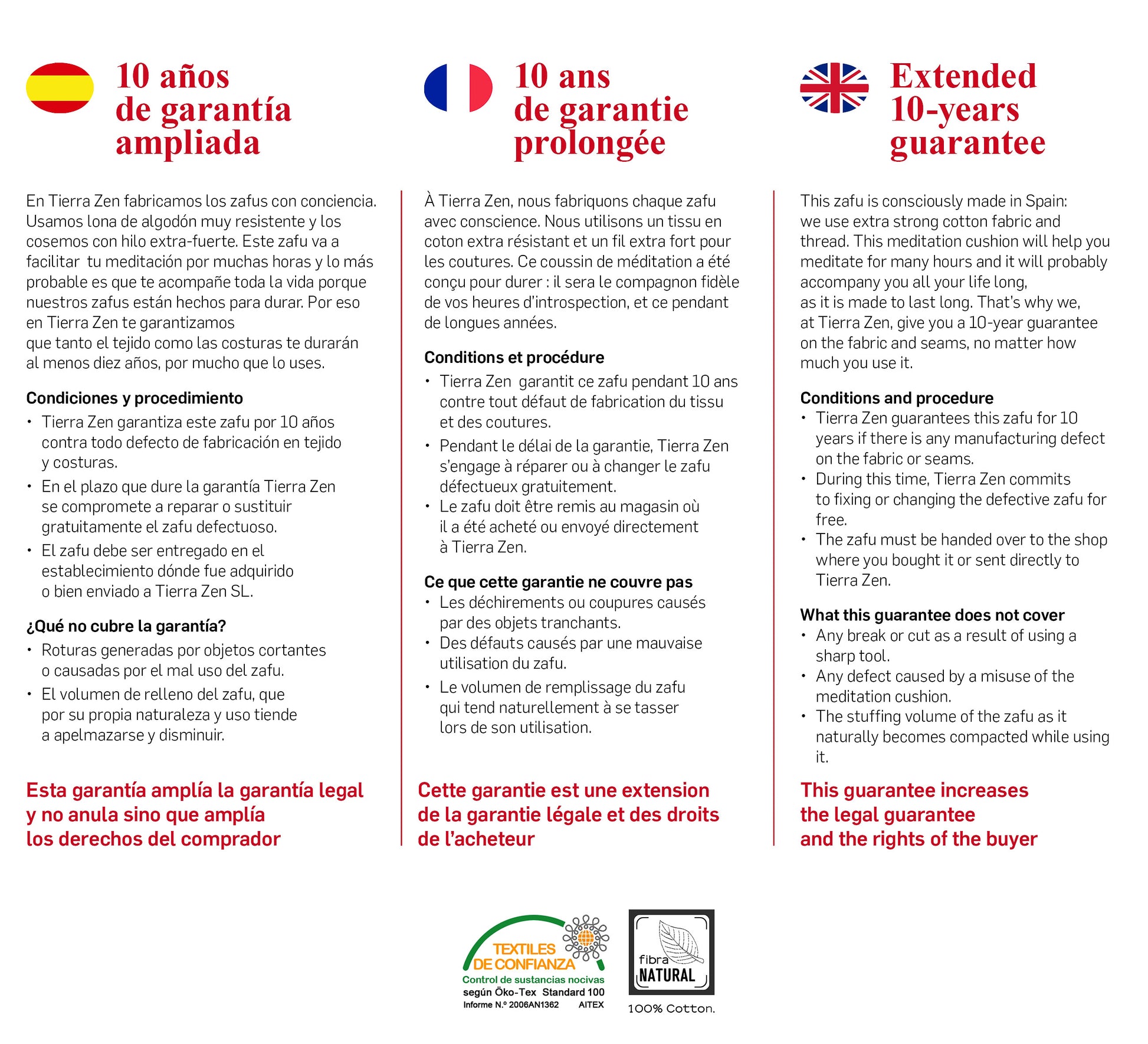 Este zafu é feito à mão com tecido 100% algodão extra forte, uma costura tripla e uma fita branca para escrever o seu nome. É feito conscientemente em Espanha e temos o orgulho de lhe oferecer uma garantia alargada gratuita de 10 anos.