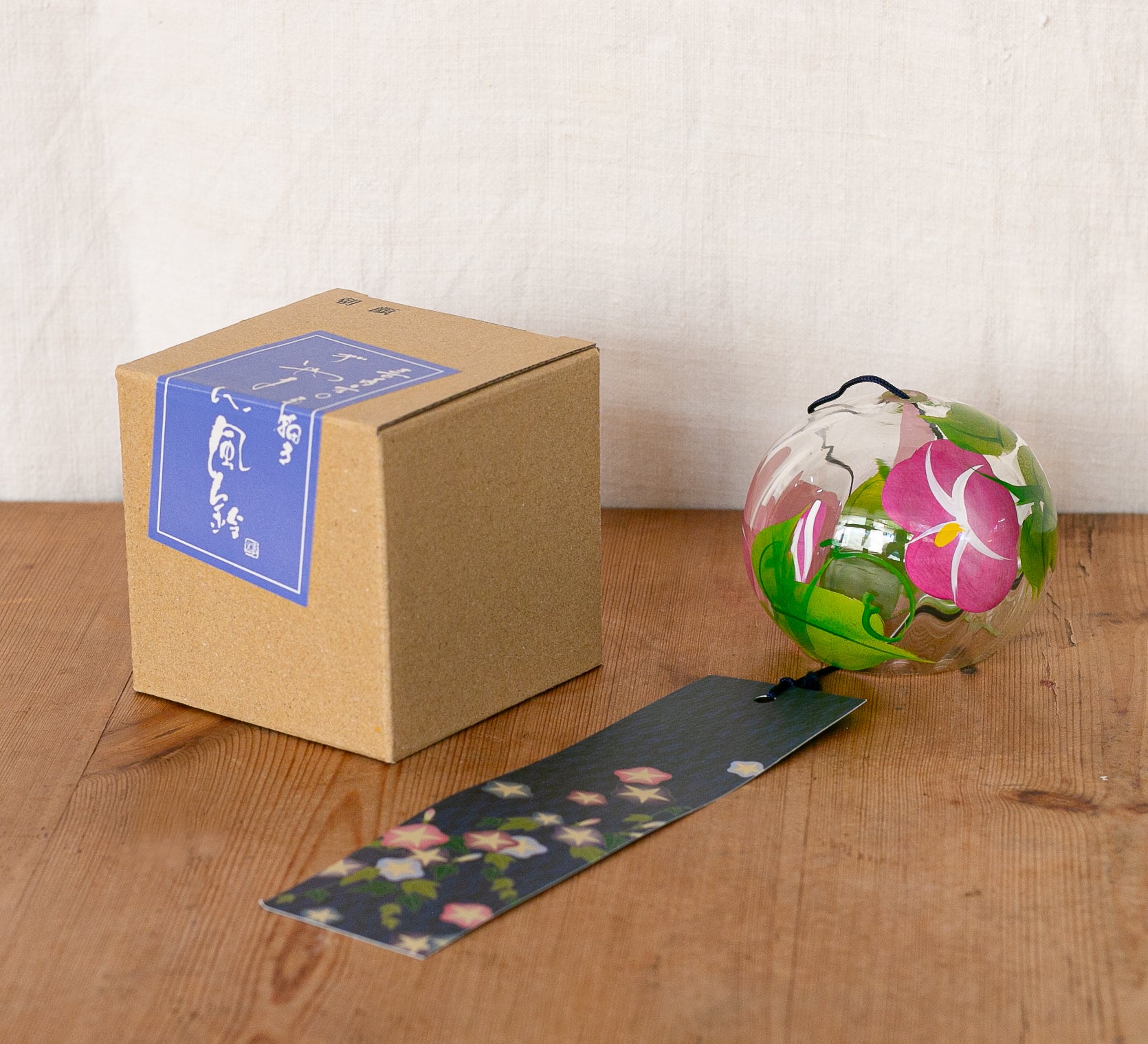 O furin é um sino de vento tradicional japonês que simboliza o verão. Durante os dias quentes e húmidos, o seu som refrescante traz alívio. Este furin em vidro soprado é feito à mão e pintado à mão no Japão. Foi concebido de forma a que o vidro seja mais espesso na boca, o que melhora o seu timbre.