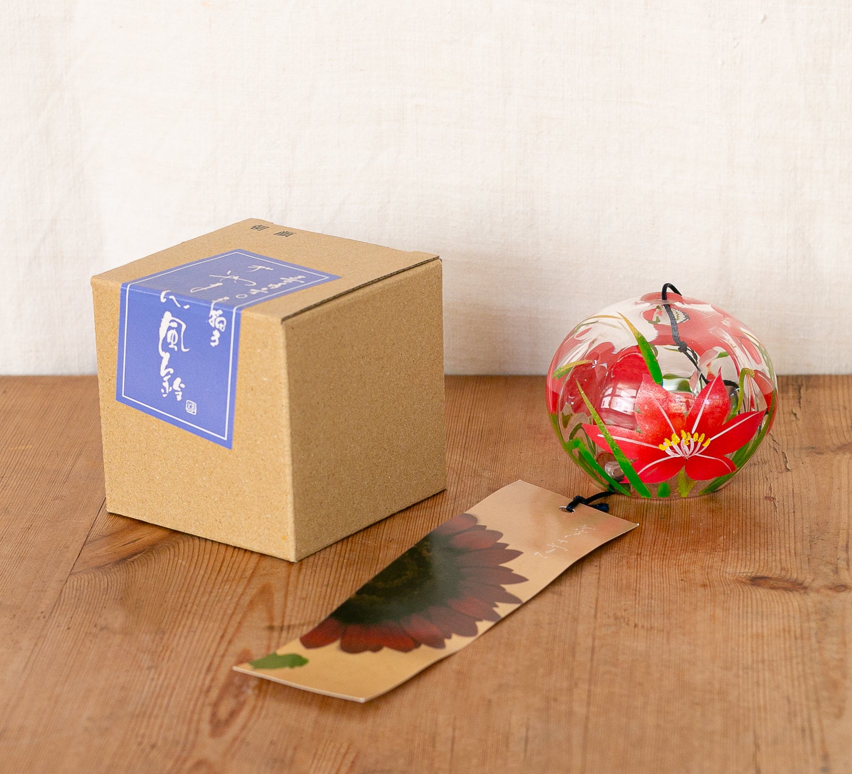 O furin é um sino de vento tradicional japonês que simboliza o verão. Durante os dias quentes e húmidos, o seu som refrescante traz alívio. Este furin em vidro soprado é feito à mão e pintado à mão no Japão. Foi concebido de forma a que o vidro seja mais espesso na boca, o que melhora o seu timbre.